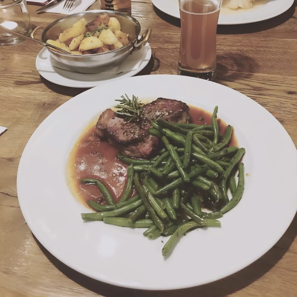 Chúng tôi ghé qua nhà thờ cổ kính, rồi dừng lại ăn trưa tại một quán kiểu Đức – món thịt nướng cùng đậu xanh và bia lúa mạch thật tuyệt!